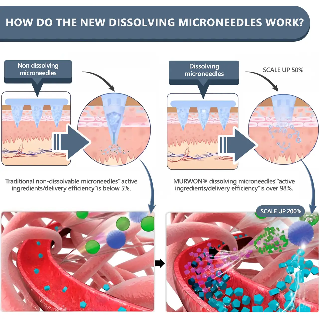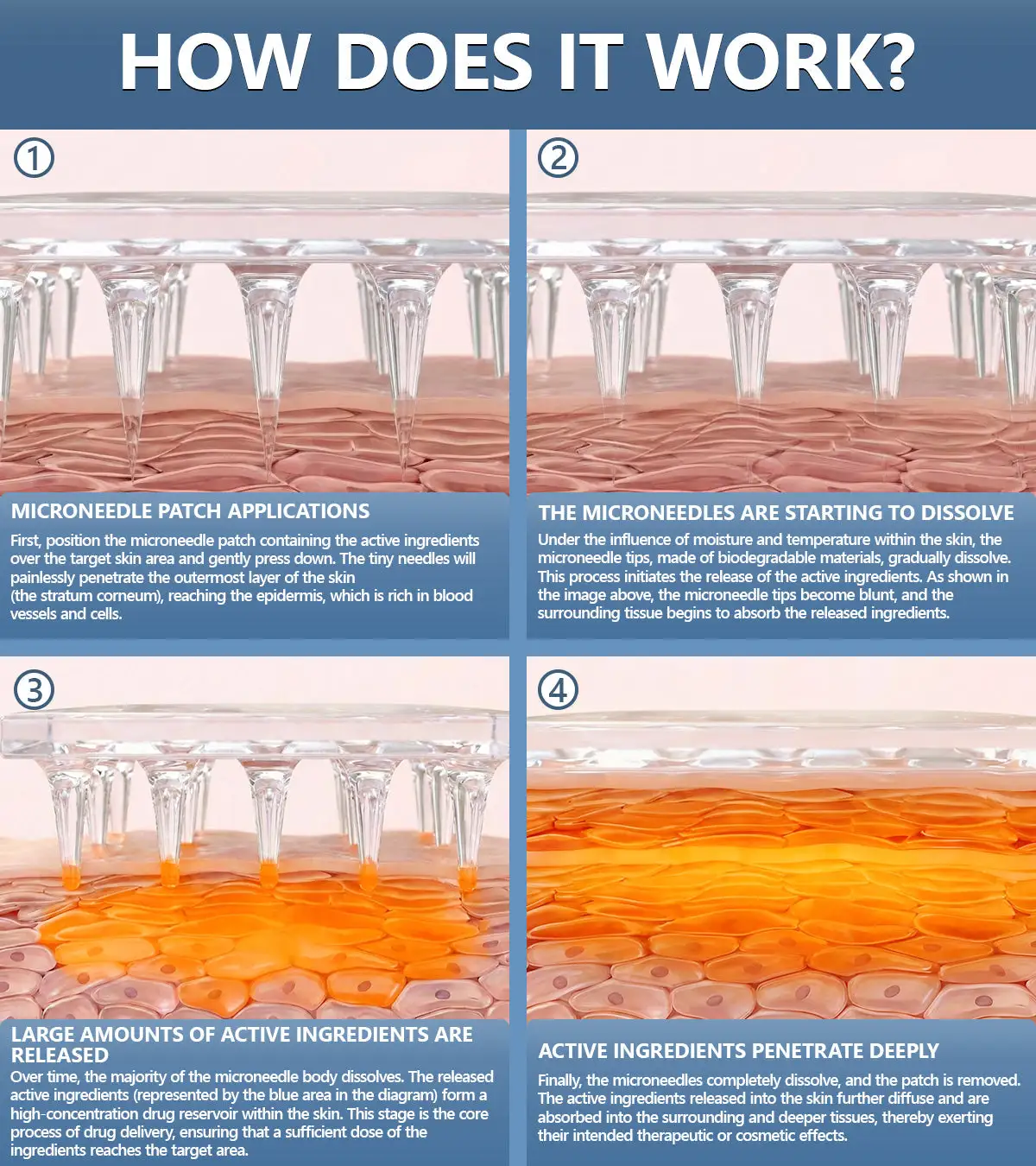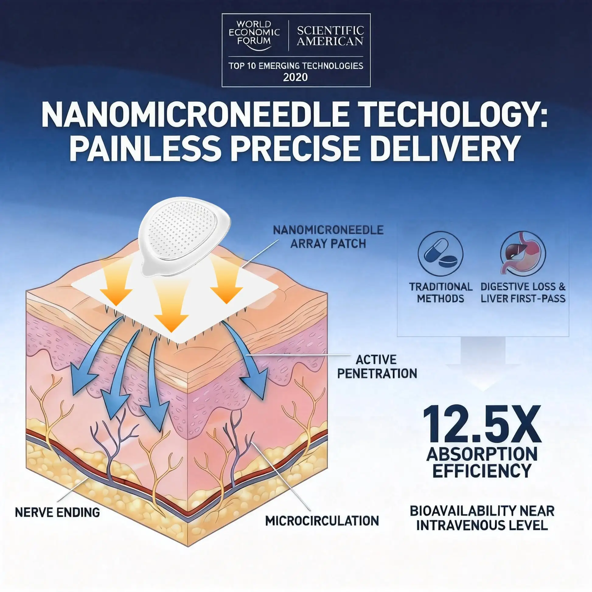 This “active infiltration” mechanism completely bypasses the acid-base degradation in the digestive tract and the “first pass effect” of the liver associated with traditional supplements. According to clinical studies published in Frontiers of Pharmacology; Compared with traditional local applications, nano microneedle patches can increase the absorption efficiency of active ingredients by more than 12.5 times. This technology not only precisely targets skin microcirculation, but also has a bioavailability close to intravenous injection, achieving a qualitative leap from “surface retention” to “deep tissue transport”.