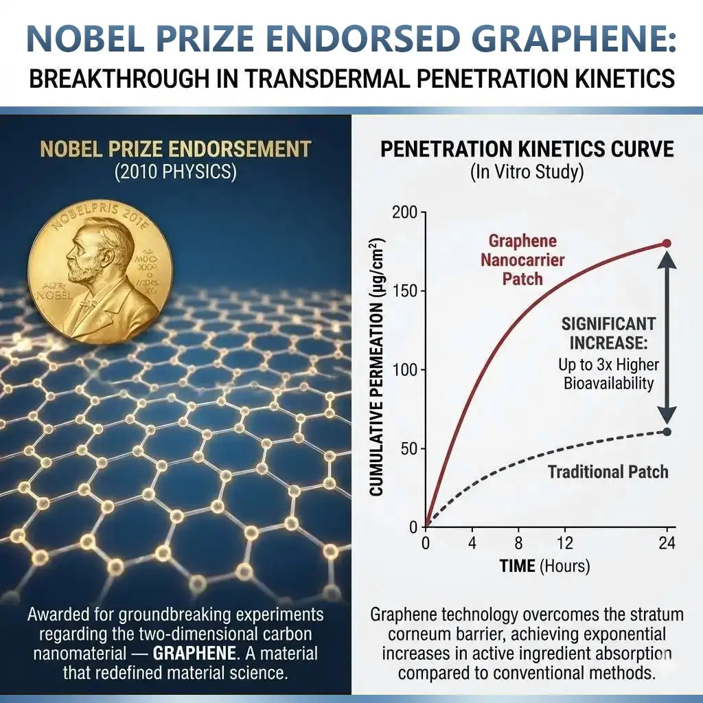 Nobel Prize winning technology: redefining the boundaries of biological delivery. The core technology of this product is rooted in disruptive research on graphene, a two-dimensional carbon nanomaterial that won the 2010 Nobel Prize in Physics. Graphene isย exhibits extraordinary thermal conductivity and mechanical strength beyond traditional physical limits.ย providing unprecedented penetration effects for modern transdermal drug delivery systems (TDS)This technological breakthrough not only solves long-standing industry bottlenecks in molecular-level penetration but also ensures that core active moleculesโsuch as Berberine and NDAโreach the deep dermis with extremely high permeability. with a penetration rate of up to 98%.