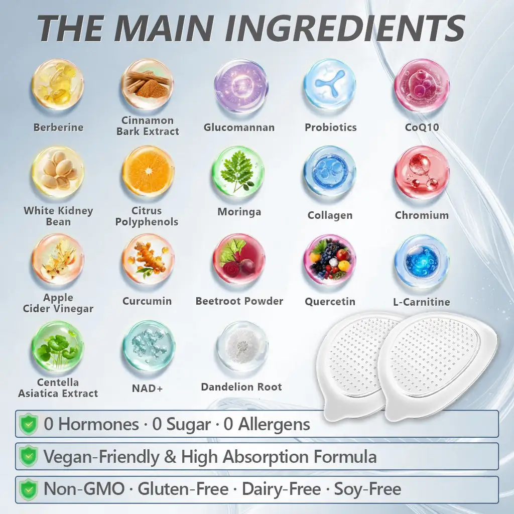 Apple cider vinegar powder, white kidney bean extract, and cinnamon extract work synergistically on carbohydrate metabolism and gut motility by reducing digestive enzyme activity and supporting hepatic and biliary detoxification and bile flowโpromoting fat digestion, nutrient absorption, and endotoxin clearance to maintain a more balanced intestinal environment. Moringa, green tea extract, and coriander seed extract, rich in natural polyphenols, help inhibit pathogenic bacteria, support the expansion of beneficial probiotics, and enhance microbiome diversity, improving bloating, irregular bowel movements, and overall digestive discomfort.