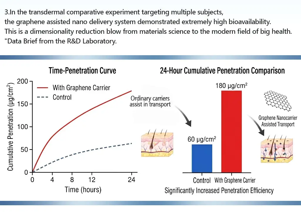 The far-infrared (FIR)”Light of Life”released by graphene in the$8-14mu m$range resonates deeply with human molecules upon thermal activation. This molecular-level energy coupling precisely targets the”Bricks and Mortar”structure of the stratum corneum, driving a reversible phase transition of the lipid bilayer from a low-permeability”gel state”to a highly permeable”liquid crystal state,”instantaneously opening micro-penetration channels. Augmented by a nanocarrier gradient, this mechanism elevates theskin penetration rate to a staggering 98%, effectively shattering the conventional absorption bottleneck.